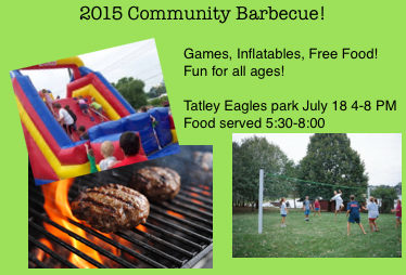 2015 Community Barbecue July 7, 2015 News Please join us! All are welcome. Inflatables, Games, Entertainment Burgers, dogs, sides, games, fun, community. This is an event for our entire community. Saturday July 18th 4-8PM Food served 530 till its gone… don’t miss out! Share this:TwitterFacebookEmail