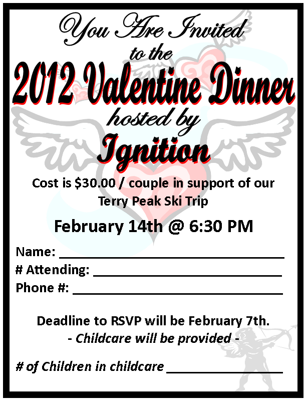 Valentines Day is right around the corner! Why not let the kids of BCC Ignition take care of your dinner needs by attending the 2012 Valentines Dinner. Come and enjoy a relaxing night full of food, music, and one on one time with your special someone. We will even take care of childcare for you! Cost is $30 / couple, or $15 / person. The dinner starts at 6:30 PM on Tuesday, February 14th. All proceeds go towards supporting the ski trip Ignition will be taking March 8-12. We all hope to see you there!